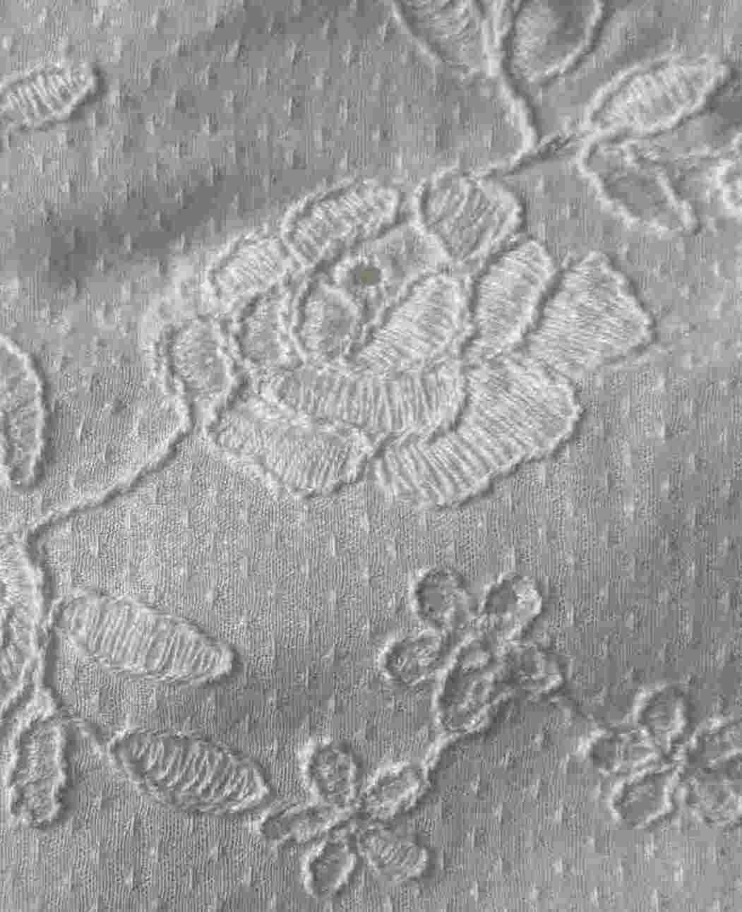 Cotton white fabric with all over self colour embroidery rose design .