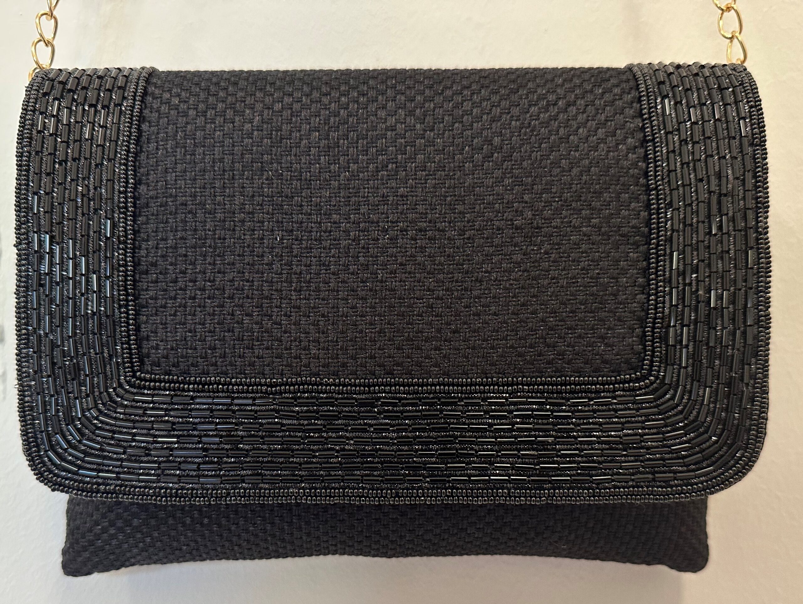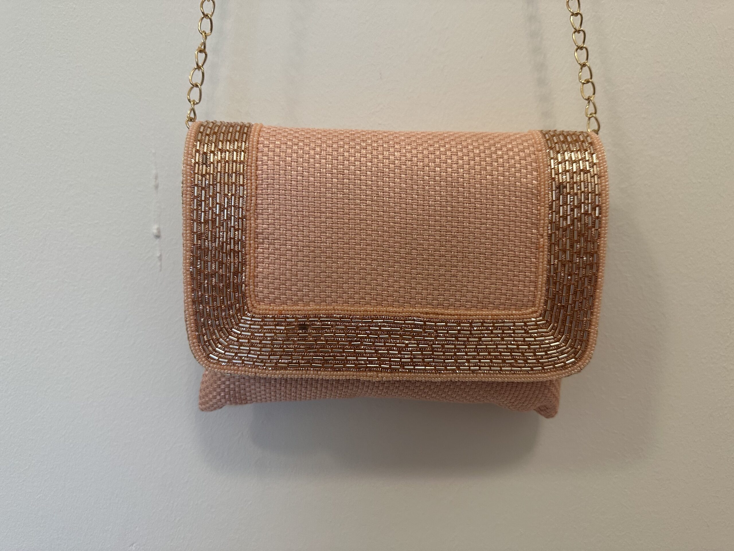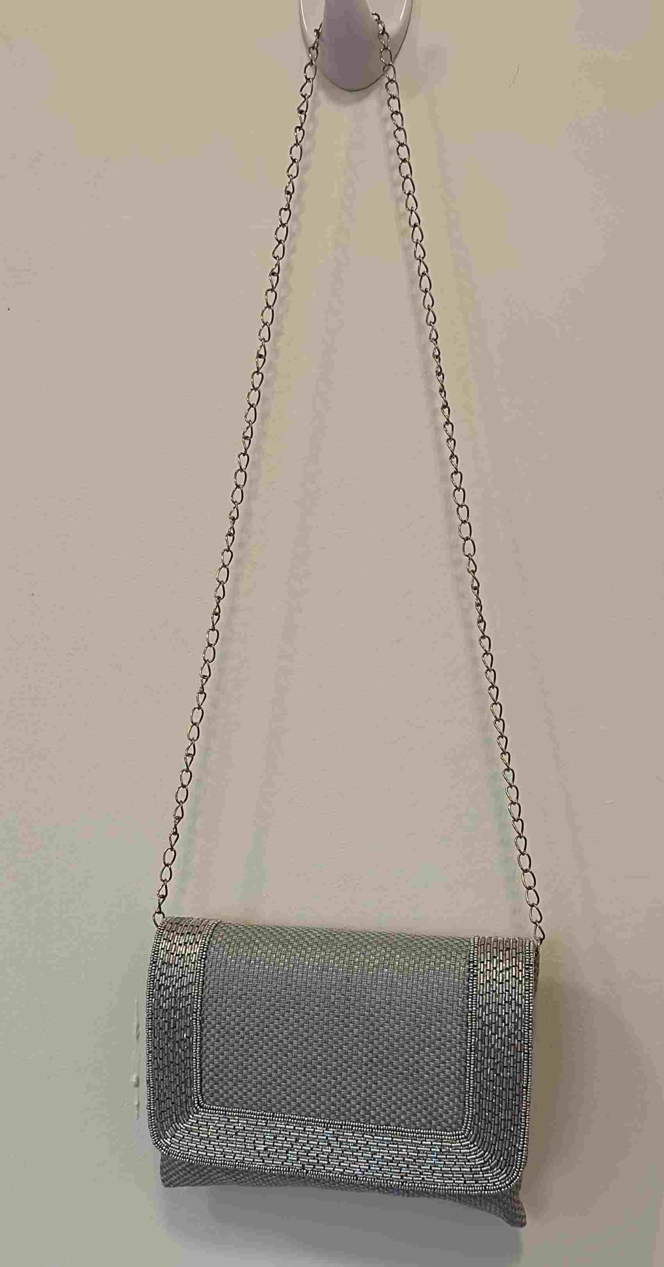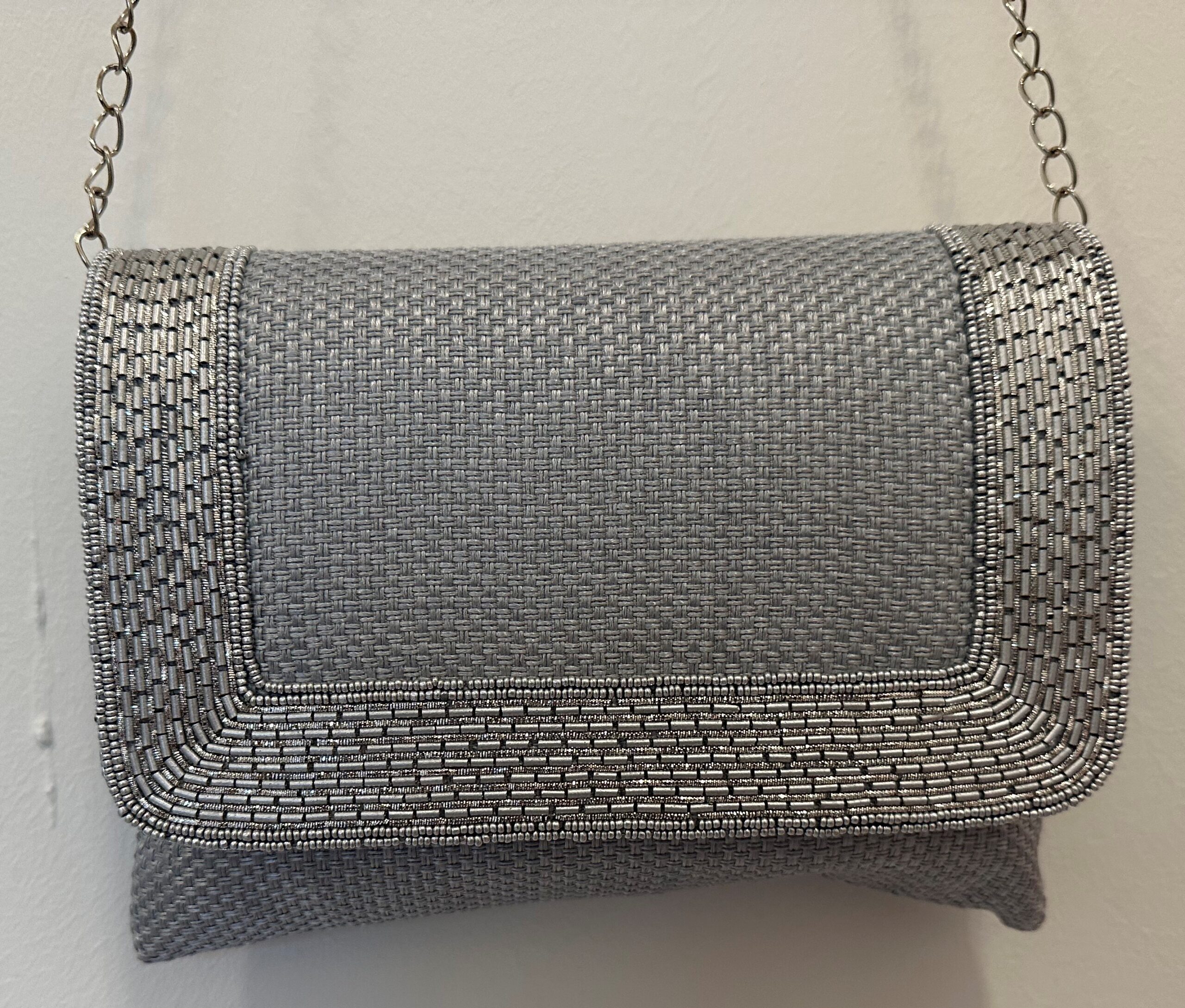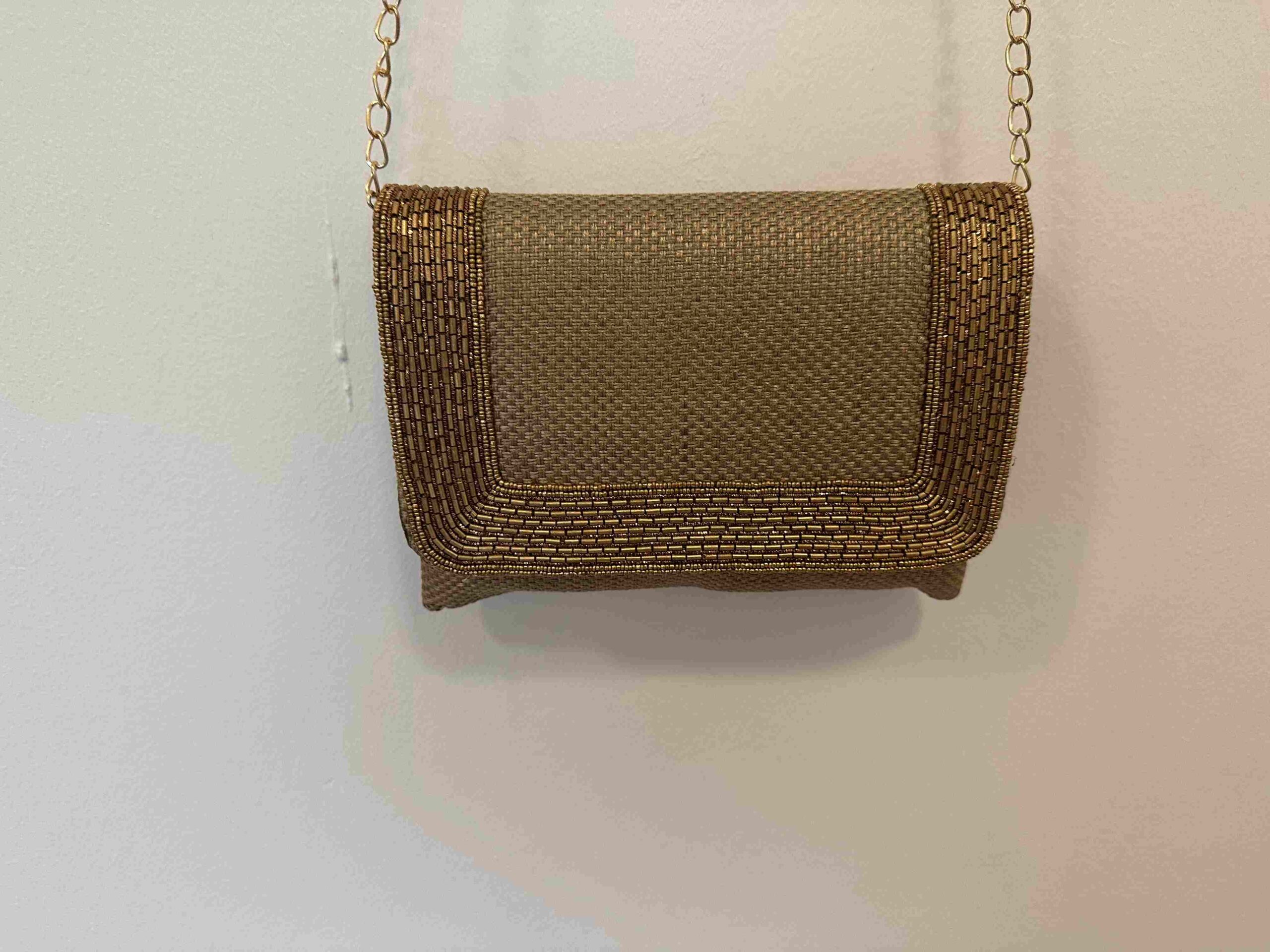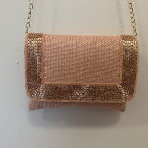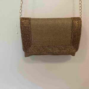 High quality classic jute clutch with a intricate sequins border and long chain for shoulder .